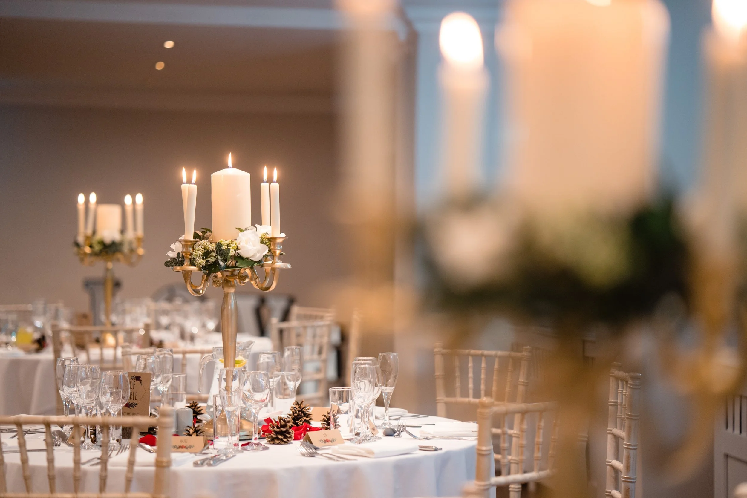 Tables featured gold candelabras, with red rose petals and pine cones, to complete their winter theme and compliment their stationery.