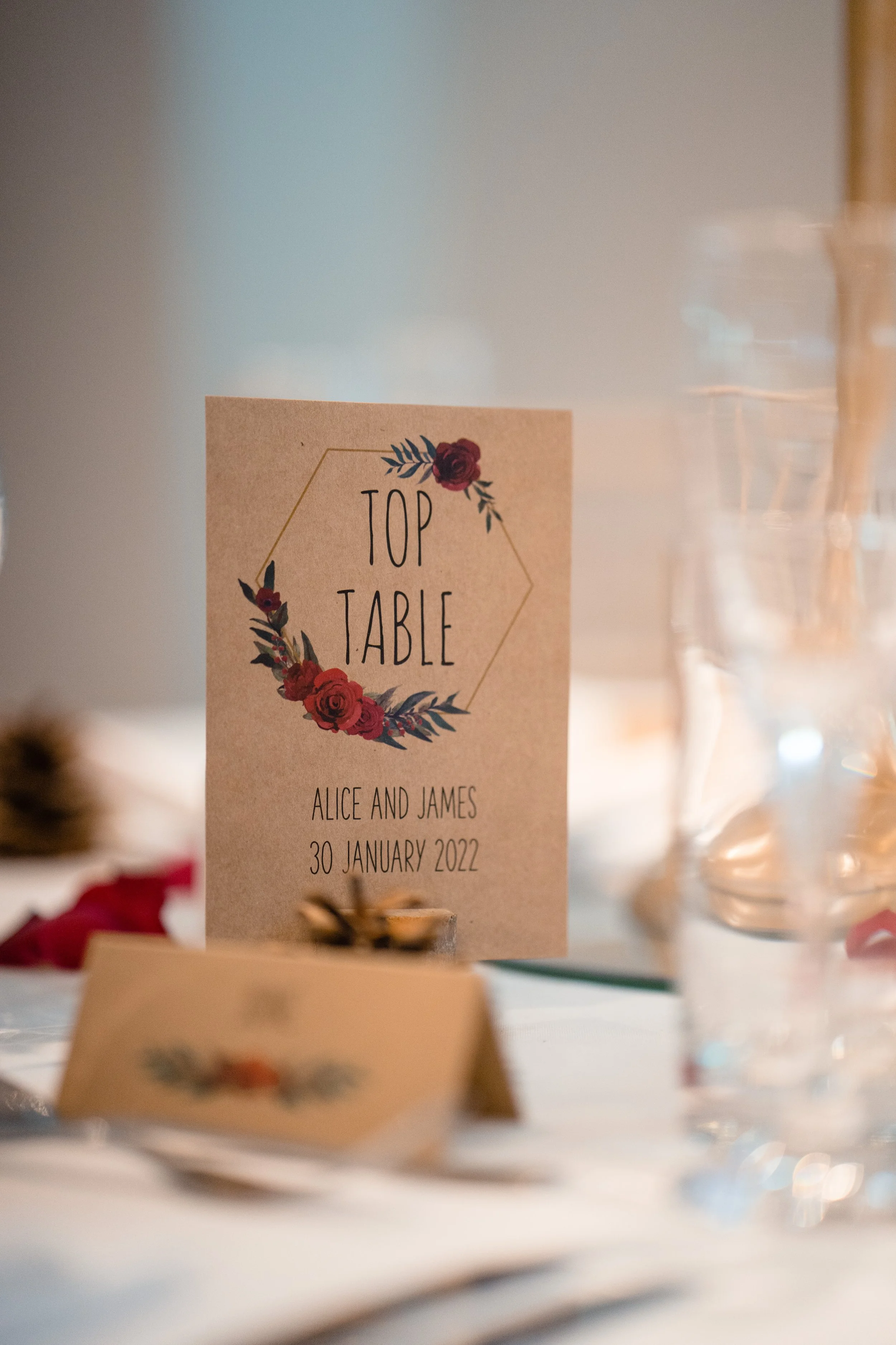 The couple chose not to have a traditional top table and opted for a round table instead. They also didn’t want the formalities of speeches, so went straight into their wedding breakfast. Alice & James gave their guests a choice menu of: