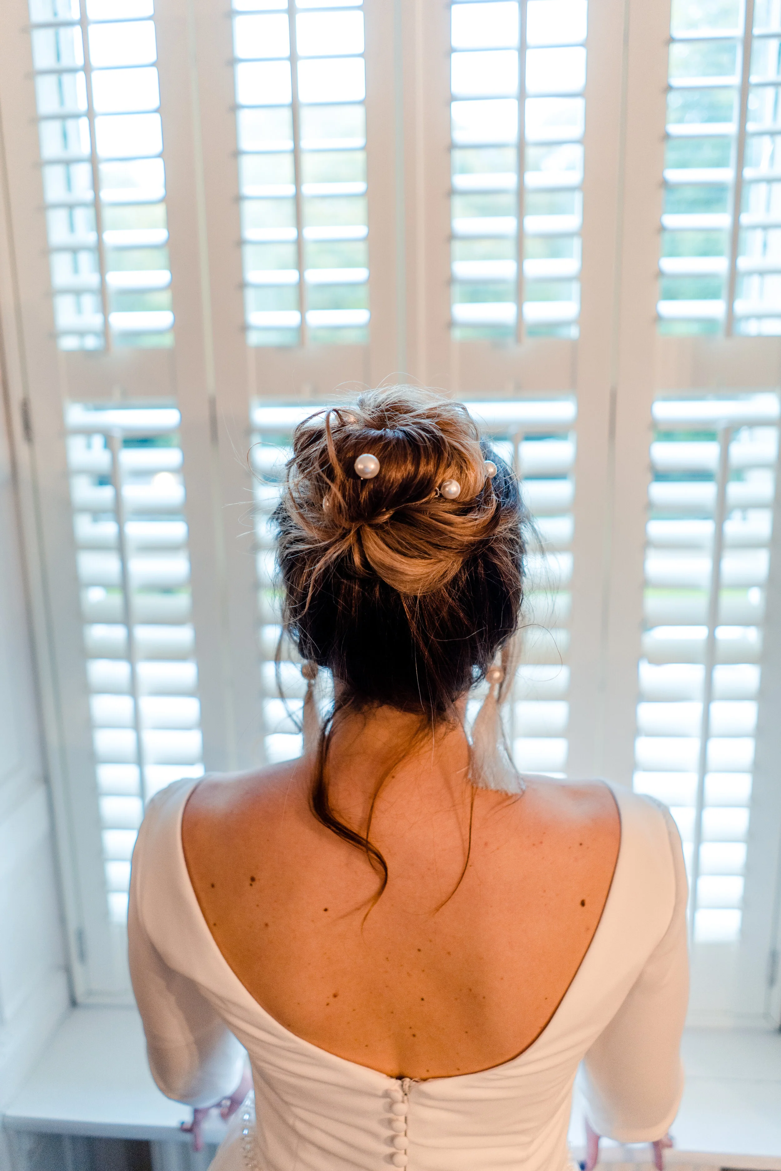 Opposites attract so for the second look we chose a dark lip with a slight smokey eye and a messy bun framing the face. Purity pearl hair pins and matching tassel earrings again from Arianna Tiaras finished the look with a super long veil secured neatly under the high bun. We went for a gorgeous dusky pink satin knot, peep toe shoe which looked so cute peeking out under the dresses!