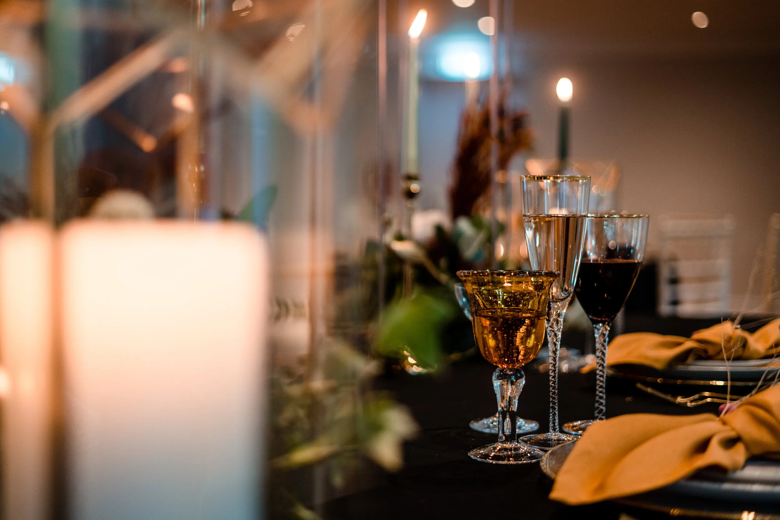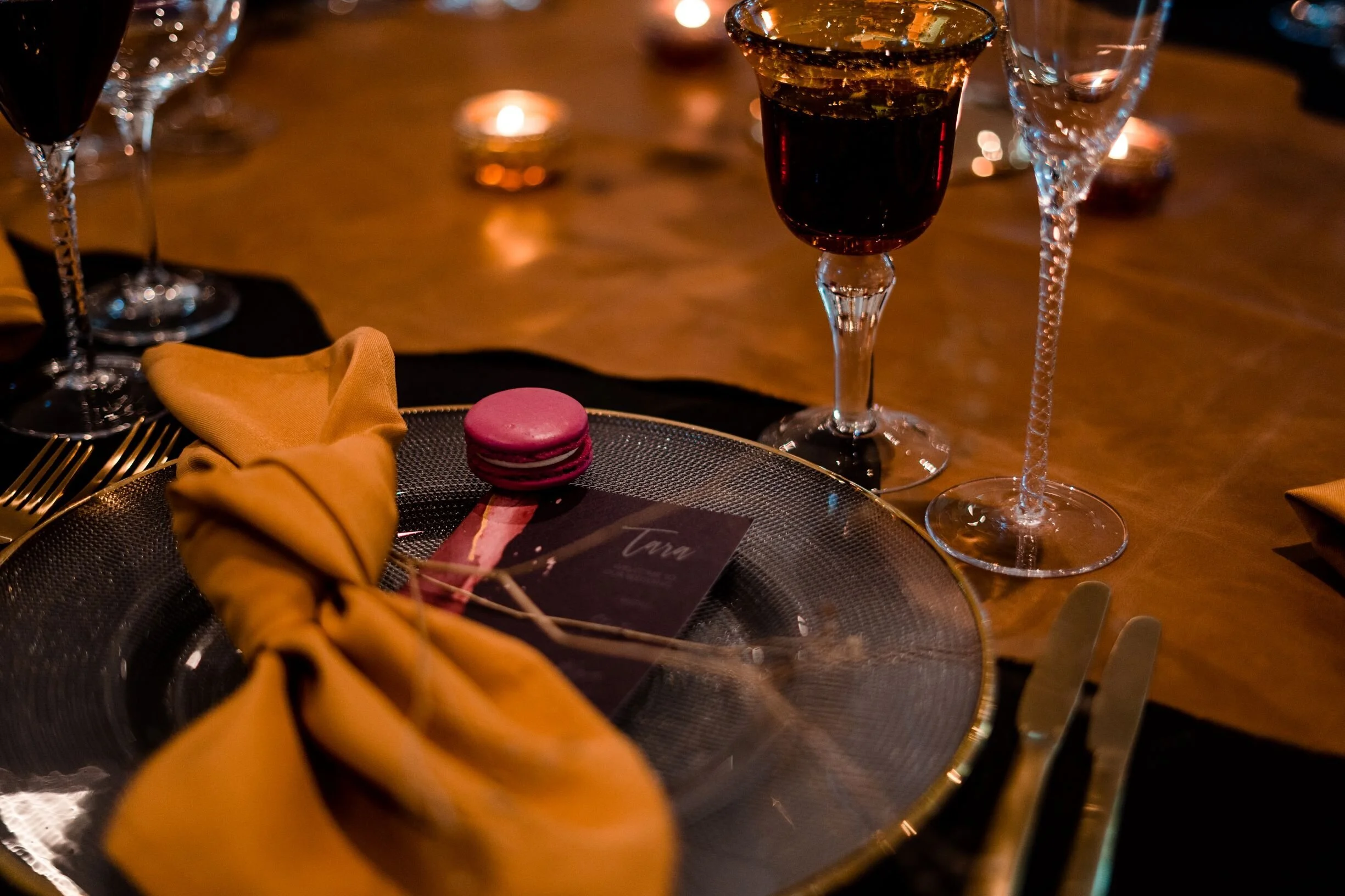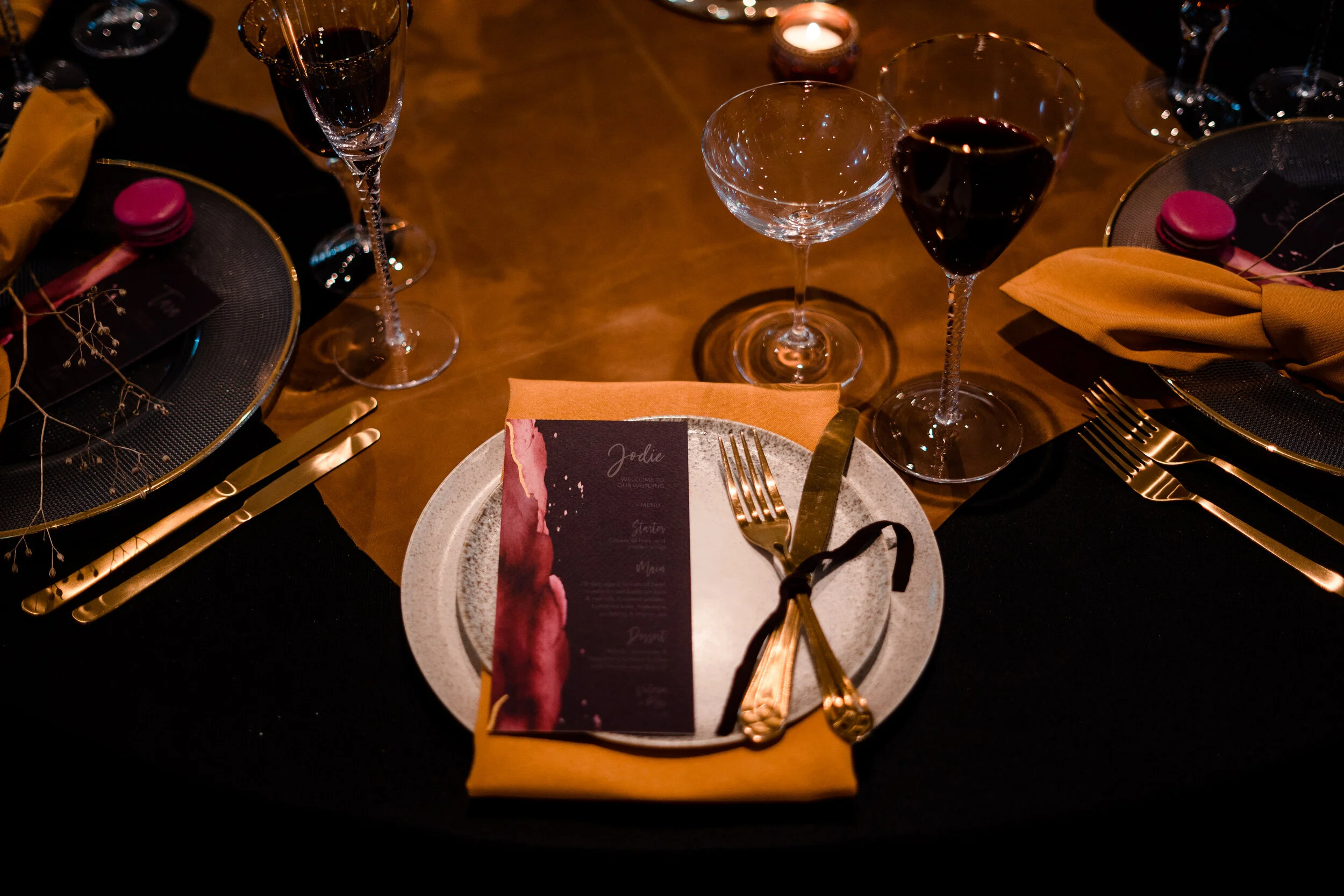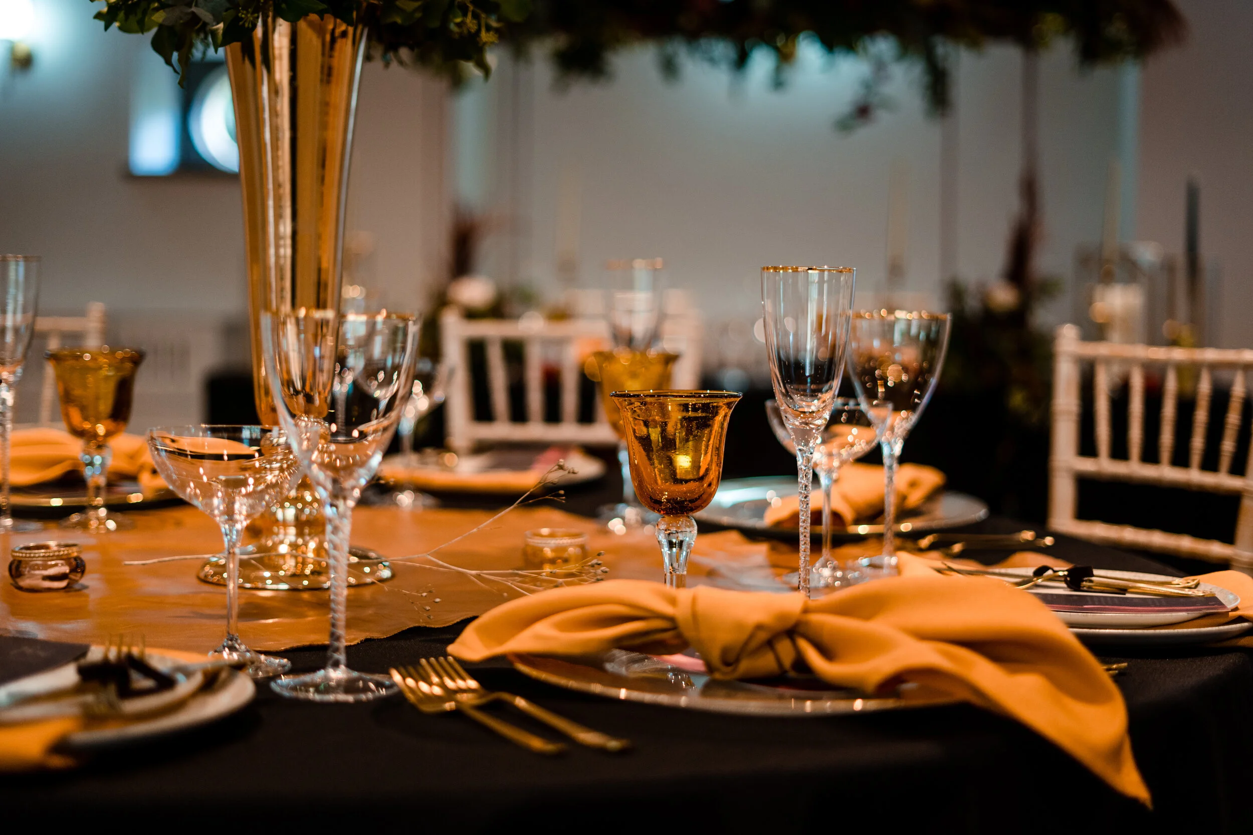 As for the tables themselves, we got in touch with the ladies at Opulent Events for linen and opted for a dark black to really stand out against the newly painted Alexandra Suite with a mustard napkin to pop against it and bring out all the touches of gold.