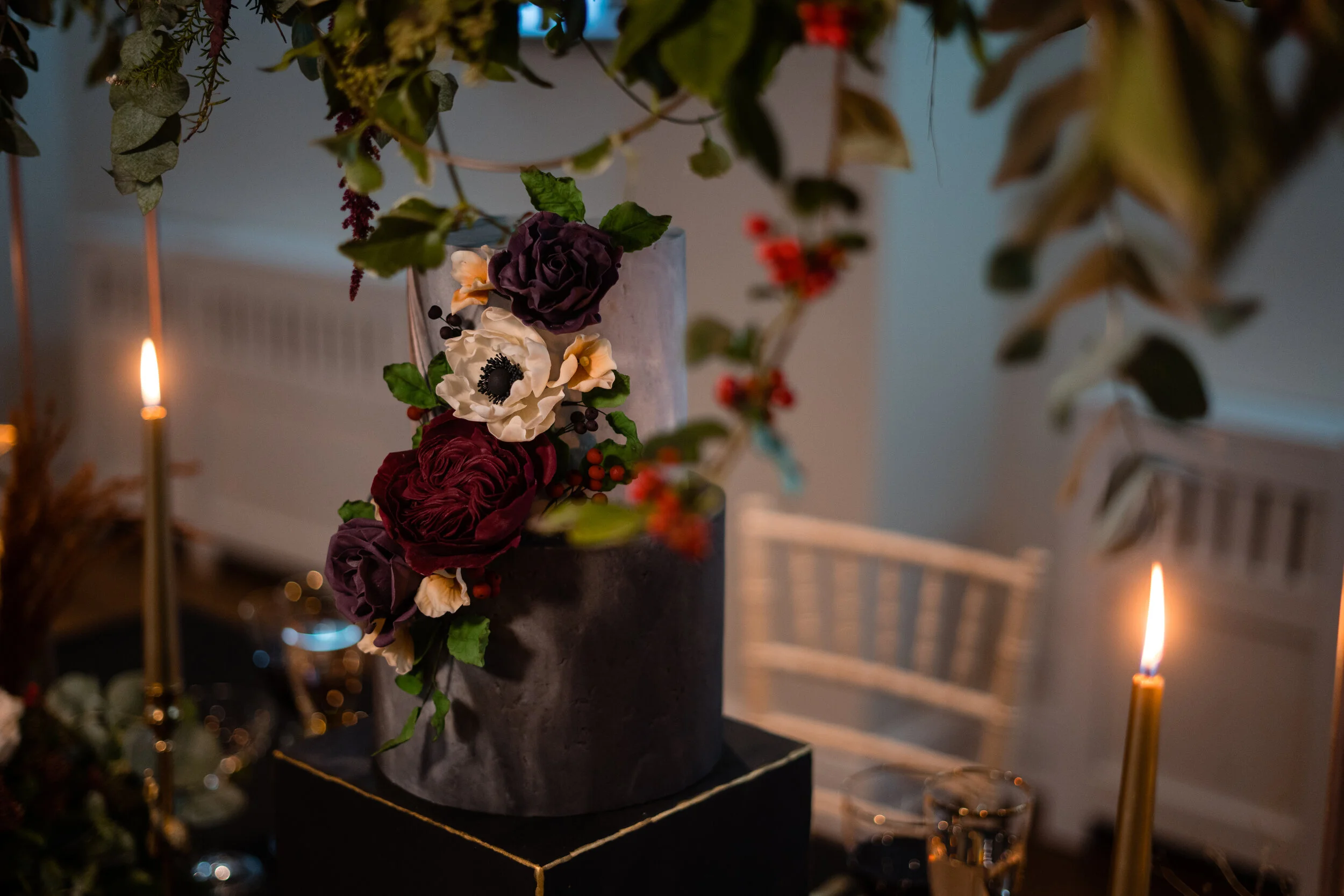 The bit where we can get really creative! Flowers and tables centrepieces were in the hands of the fabulous Julie at Hedgehogg Florist and she fully embraced the theme with candles everywhere, rich colours and lots of texture. The height on the top table display was incredible and our fabulous stone arch that we uncovered during renovations became the most beautiful photo opportunity with the floral garland added.