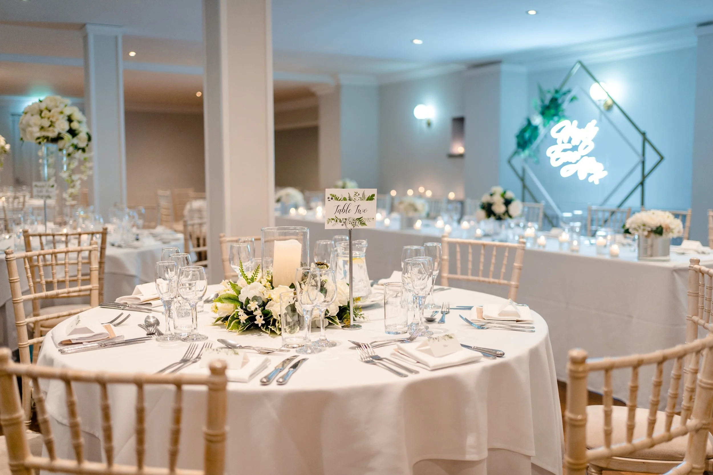 Azaira & James chose the ever popular white and green floral theme, with stationery from Let Love Sparkle Design, centrepieces from Hedgehogg Florist and backdrop from Antha Event Hire.