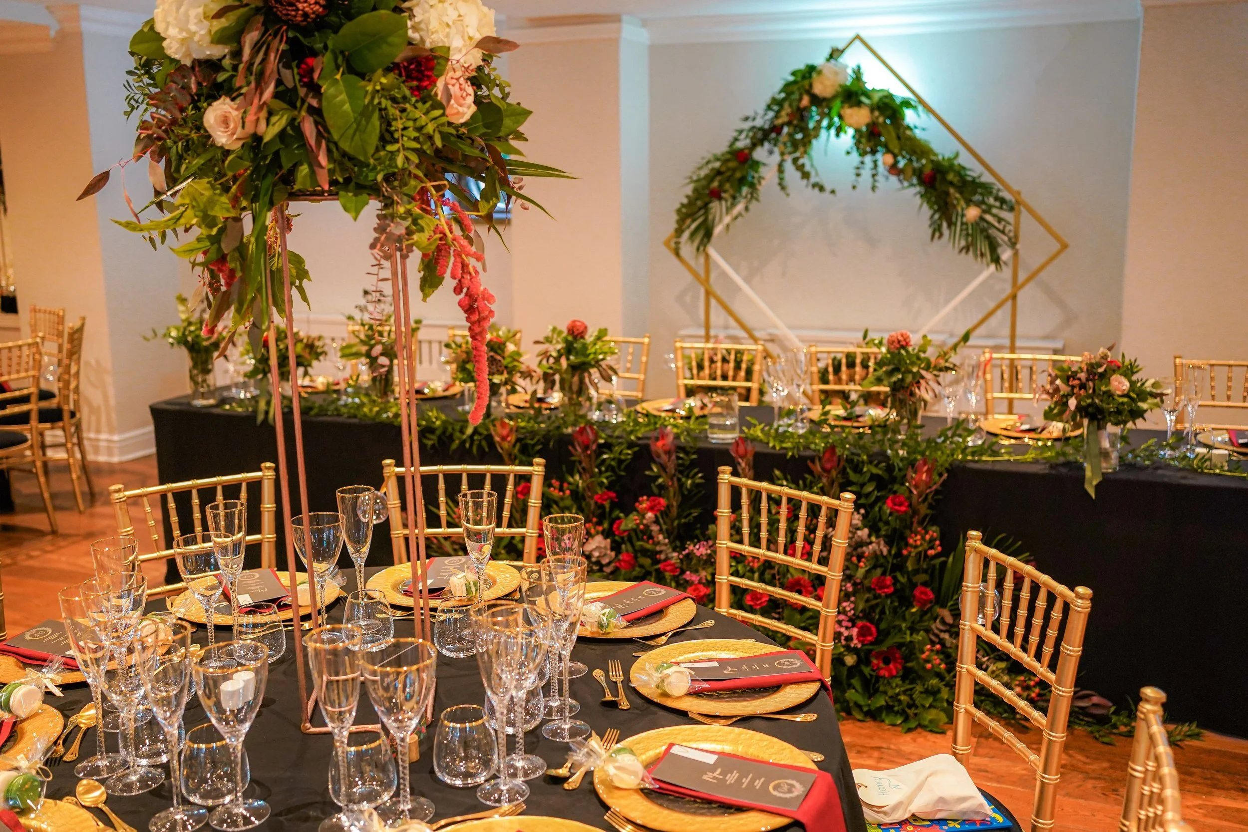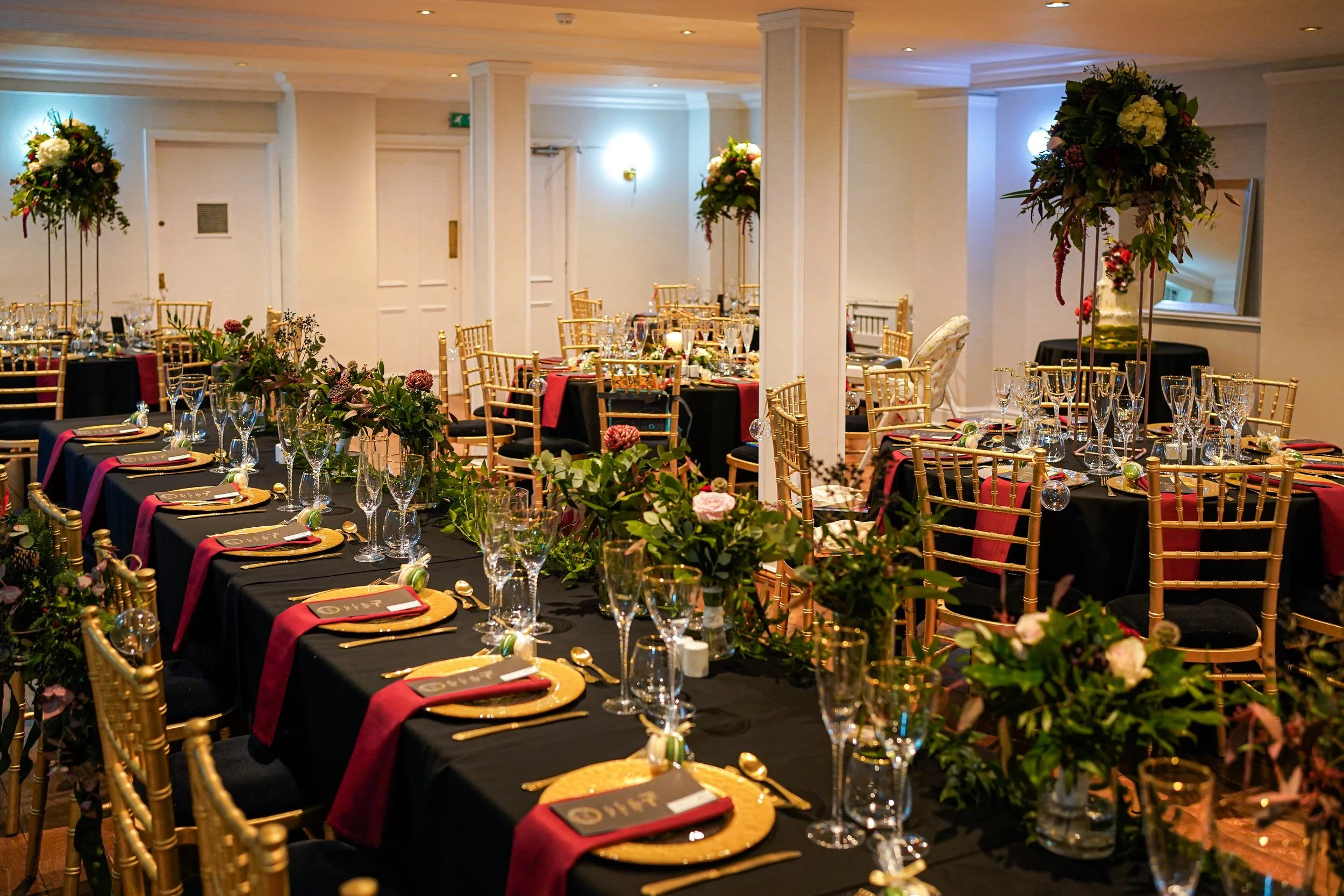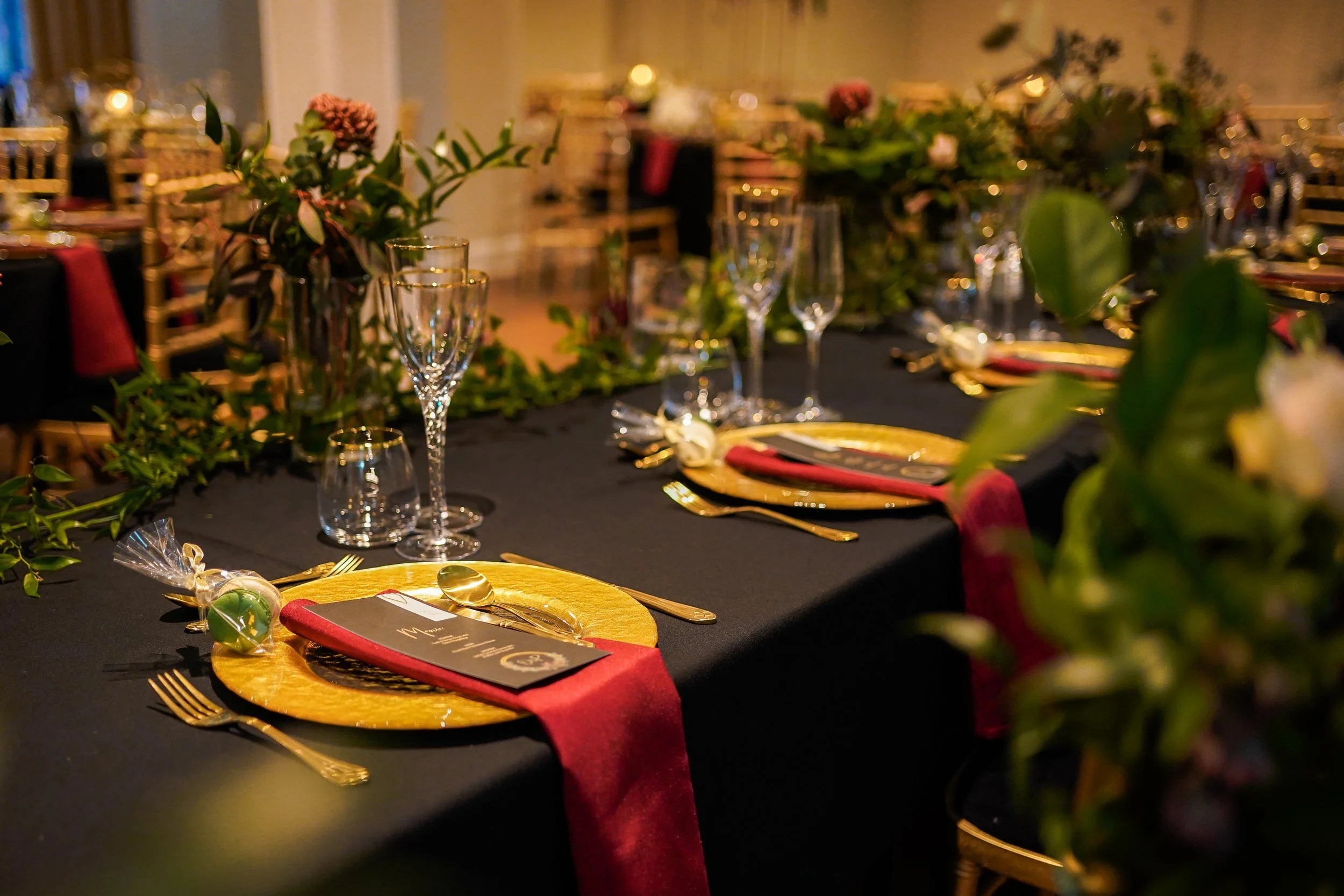 Olivia and Paul chose to really make their wedding breakfast styling their own, with gold chiavari chairs and black linen. This was complemented by gold cutlery, gold charger plates and stunning gold rimmed glassware, all from Whitehouse Crockery.